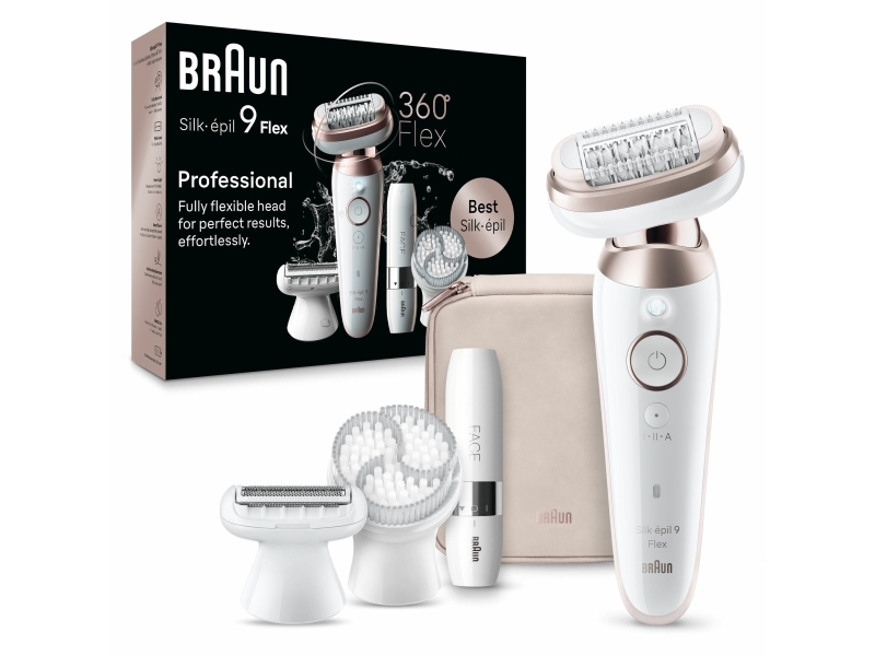Braun Silk-épil 9 Flex, Epilator med 360° flexibelt huvud, för enklare hårborttagning, Wet & Dry, långvarigt slät hud, med lady shaver-huvud och trimmerkam, 9-041 3D, Vit/Guld