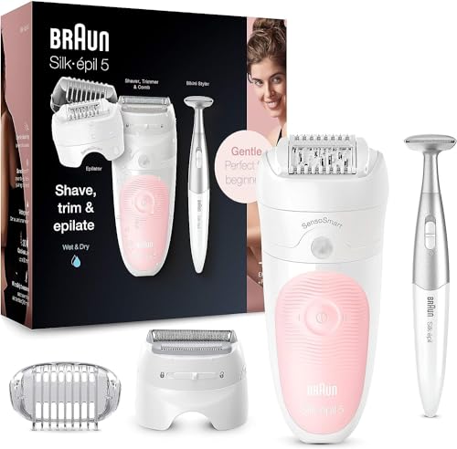Braun Silk-épil 5, Epilator för enkel hårborttagning, Wet & Dry, varaktigt slät hud, med lady shaver, trimmerkam och exfolieringsborse, 5-060, Vit/Flamingo