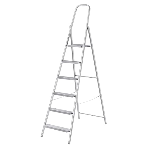 KADAX Ensidig stålstege med halkfria fötter, stegstege, stege med hylla, stegstege, vikstege, hushållsstege med breda steg (6 steg)