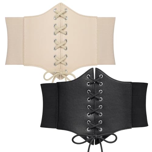 WERFORU 2 stycken dam Tied Waspie bälte, brett skosnörningsbälte för kvinnor, korsett elastisk midjebälte för halloweenfest, G-svart + beige, Passend für Taillengröße 109-118cm