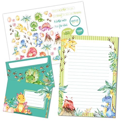 Papierdrachen Brevblock set – 50 färgglada tryckta brev – brevpapper med klistermärkesark – 20 tryckta kuvert – presentidé för barn – dinosaurier – set 5