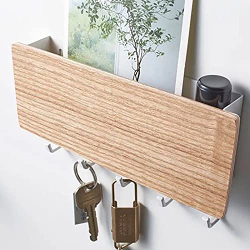 MISNODE Nyckel- och brevhållare för vägg, nyckelhängare för vägg med hylla, trävägghylla med 5 krokar, hängande nyckelhållare för kök och entrédekor, kaki