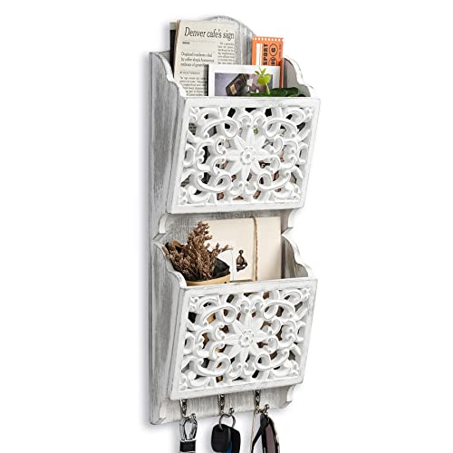 Optyuwah Brevfack tidningsställ trä med 4 nyckelbrädskrokar, shabby vit korthållare postabfack med europeiska urholkningar brevfack brevhållare och nyckelhållare nyckelkrokar