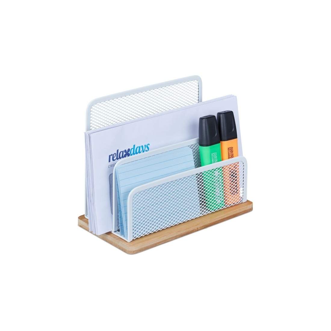 Relaxdays Brevhållare, metall och bambu, 3 fack, HBT: 15 x 18,5 x 10 cm, skrivbordsbrevhylla, brevställ, vit/natur