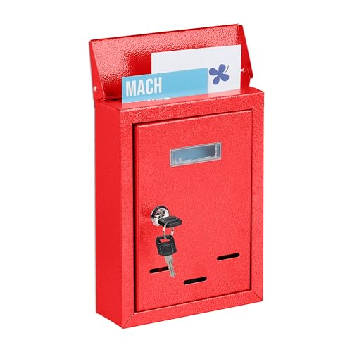 Relaxdays brevlåda/brevlåda gjord av metall, lock med gångjärnslock med namnplatta + 2 nycklar, HxBxD: 26,5 x 35 x 8,5 cm, röd, stål