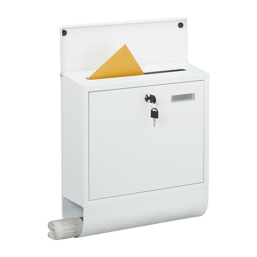 Relaxdays brevlåda med tidningsfack, H x B x D: 37 x 37 x 12 cm, järn, 4 nycklar, brevlåda med inskription, vit