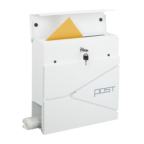 Relaxdays brevlåda med modern design, metall, 4 nycklar, med tidningsfack, H x B x D: ca. 38 x 37 x 12 cm, vit