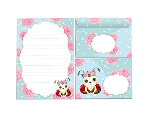 Brevblock med kuvert för barn nyckelpiga brevpapper set för flickor (lock A5 med 25 ark 15 kuvert)