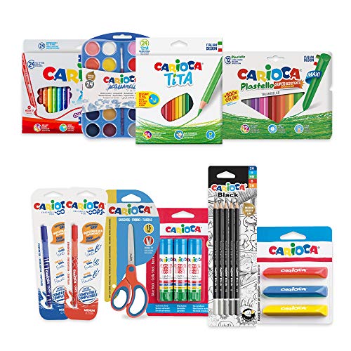 CARIOCA Back To School | Tillbaka till skolan brevpapper set med färg- och grafitpennor, akvareller med pensel, markörer, raderbara pennor, vaxer, gummi, saxar och sticklim, 100 st
