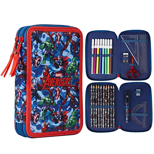 Marvel Pennafodral med brevpapper inkluderade skolmaterial fyllda stora pennfodral flera fack målarpennor pennpennor pojkar brevpapper set gåvor till pojkar, En storlek, Avengers Blue/Red