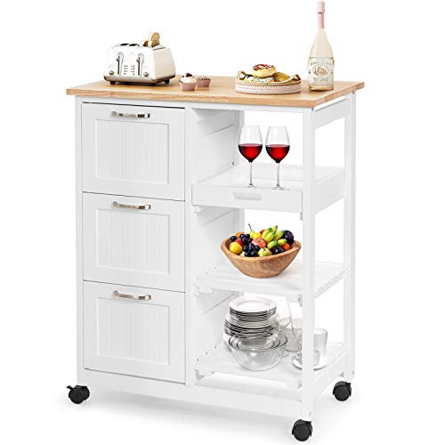 GOPLUS Köksvagn med förvaringsutrymme, serveringsvagn på hjul med 3 djupa lådor, öppna hyllor och avtagbar bricka, rullvagn för kök matsal bar restaurang (vit)