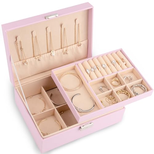 Meschett smyckeskrin med 2 lager, PU-läder, smyckeshållare organiserare med lås och avtagbar bricka, smyckesorganisatör för ringar, örhängen, halsband, armband, smyckeskrin för kvinnor, rosa