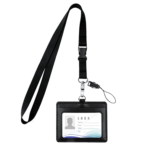 Vicloon Badge-hållare med snodd, ID-bricka i PU-läder med kortplats, transparent fönster för kontorsbruk, avtagbar nackrem, svart