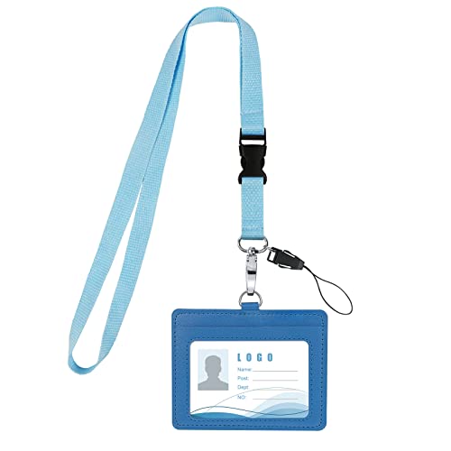 Vicloon Korthållare med Snodd - 2-Sidig PU-Läder ID-Bricka Hållare med Fönster och Kortplats, Avtagbart Halsband för Nycklar och Kontor (Ljusblå)