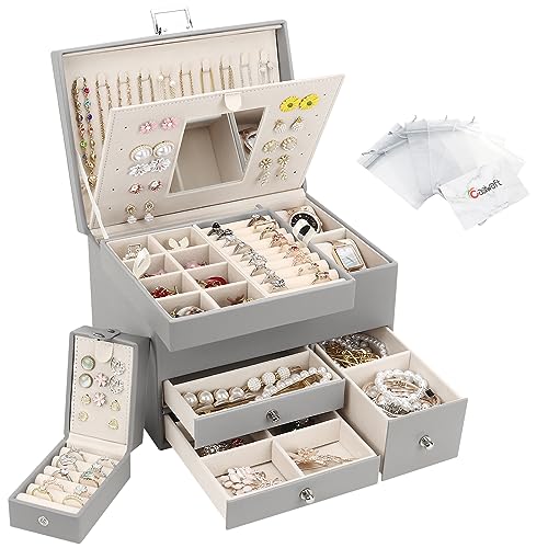 Casiwaft Smyckeskrin, 3 lager stort PU-smyckeförvaringsfodral med bärbart resväska, smyckeskrin med avtagbar bricka och spegel för halsband, örhängen, ringar, klockor, grå