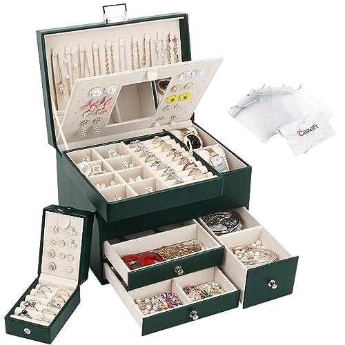 Casiwaft Smyckeskrin, 3 lager stort PU-smyckeförvaringsfodral med bärbart resväska, smyckeskrin med avtagbar bricka och spegel för halsband, örhängen, ringar, klockor, mörkgrön