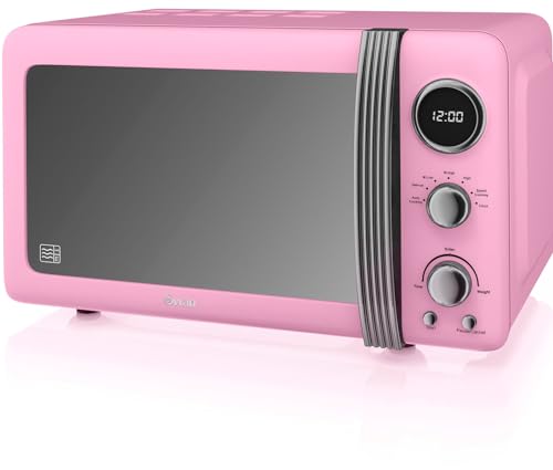 Swan Retro SM22030LPNEU 20L digitalt mikrovågsugn, 5 effektnivåer, upptiningsfunktion, 60 minuter, spegel effektdörr, roterande bricka 27 cm, vintage design, rosa, 800 W