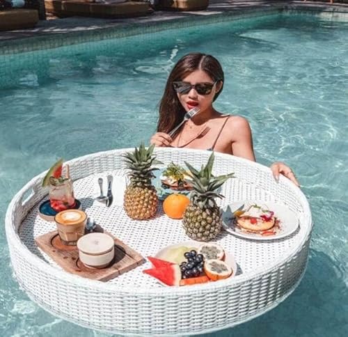 Rund rotting vävd serveringsbricka Rotting flytande frukostbricka med handtag, poolflottor, flytande bricka för poolservering, brunch, vit-80 cm