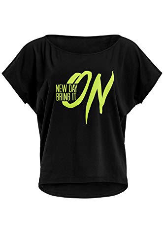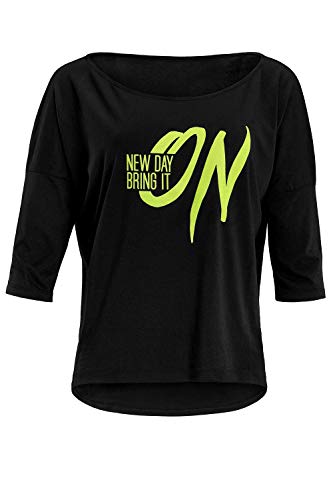 WINSHAPE Damer Winshape dam ultra lätt modal-3/4-ärm skjorta Mcs001 med neon gul "new Day Bring It On" glitter tryck yoga tröja Svarta neonpengar glittrar XL