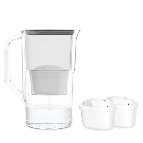 Wessper Glas vattenkanna med filter, Ersättning för Dafi Unimax Aquaphor A5 Brita Maxtra+ Philips AWP212/10 1 AQUAMAX-filter ingår, minskar kalk och klor, 3 Liter, Grått