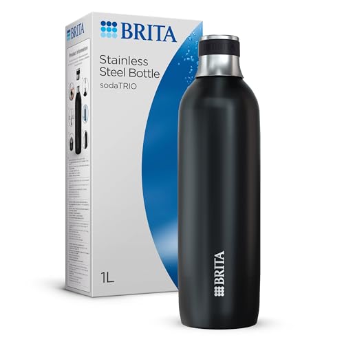BRITA SodaTRIO 1L vattenflaska i rostfritt stål, svart, isolerad med halkfritt silikonlock