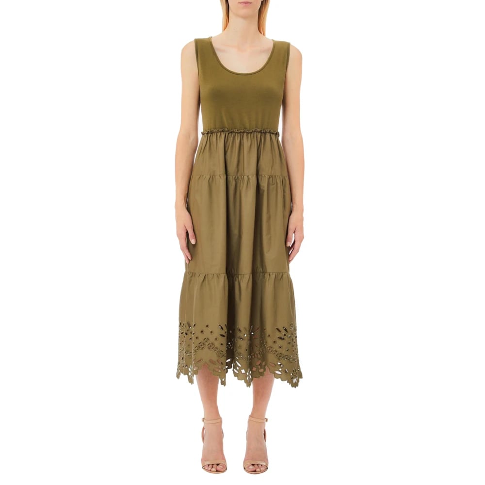 Liu Jo, Klänningar , Dam, L, Bomull, Grön Midi Klänning med Volanger och Sangallo Broderi