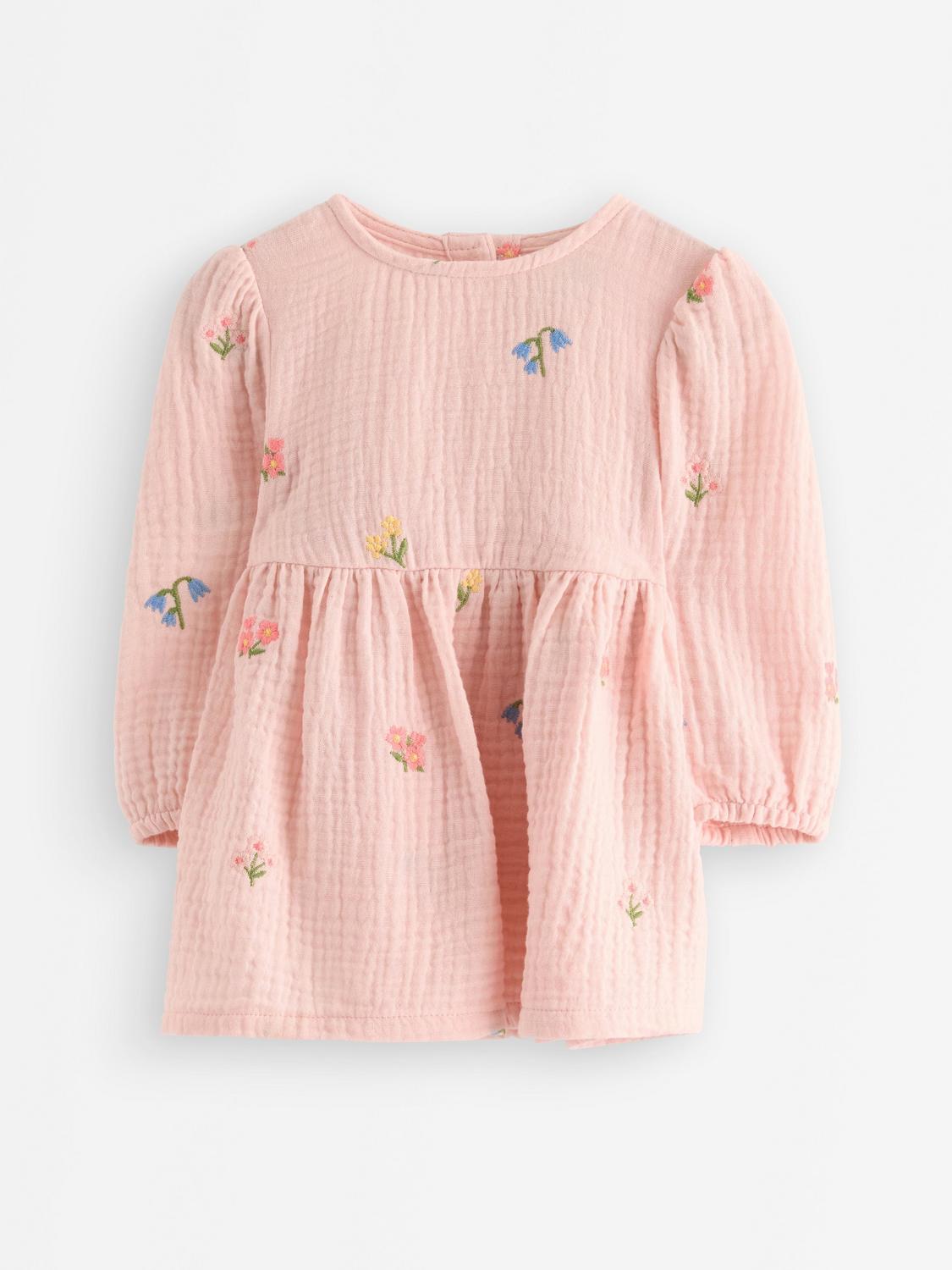 Gocco Babyflicka stor hals och broderi klänning, Ljusgrå melerad, 3 år