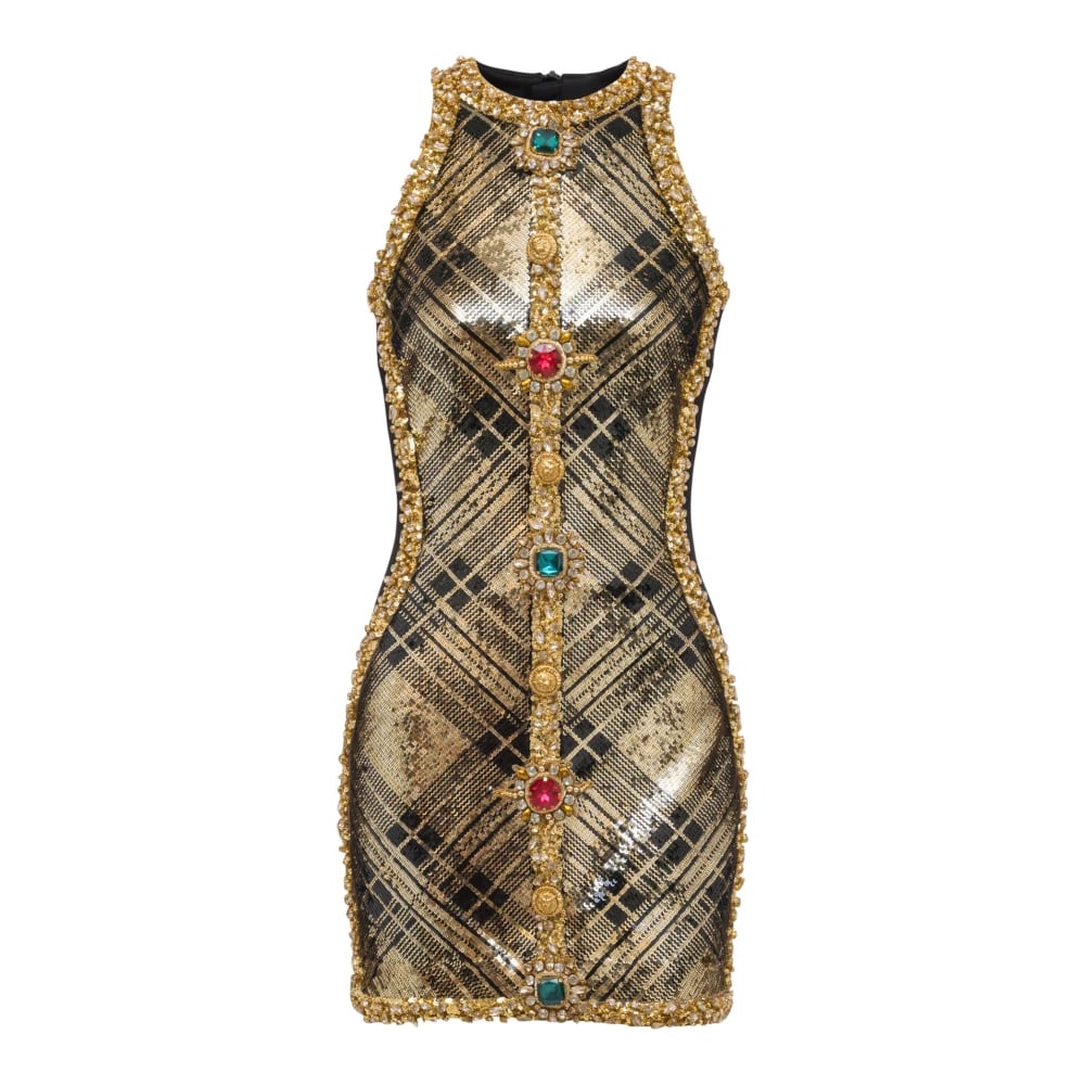 Balmain, Klänningar , Dam, M, Kort Ärmlös Klänning med Rutig Broderi