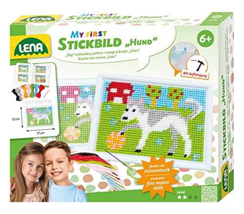 Lena 42626 – pysselset broderibild hund, komplett set med broderiram, trubbig nål av metall, ullgarn, broderigaller med förtryck och instruktioner, broderiset för barn från 6 år, set för att brodera