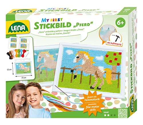 Lena 42625 – pysselset broderibild häst, komplett set med broderiram, trubbig nål av metall, ullgarn, broderigaller med förtryck och instruktioner, broderiset för barn från 6 år, inlärningskit för att