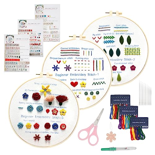 3 stycken broderiset för nybörjare, med mönster och instruktioner, korsstygnssatser med 3 broderier blommiga mönster, 1 broderiram, olika stygn broderiset för gör-det-själv-konst, hantverk, sömnad