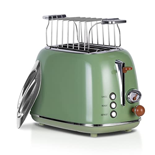 Wiltal Retro-brödrost för 2 skivor, med 6 rostningsnivåer, av rostfritt stål, med högkvalitativ hållare för frallor, uppvärm-/tinings- och stoppfunktion, nedräkningsdisplay, snabbrostteknik (grön)