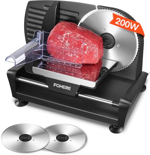 FOHERE Allskärare elektrisk 200 watt för hemmabruk, professionell brödskärare med avtagbart 2 x 19 cm blad, 0-15 exakt tjockleksknapp skärning kött skinka bröd frukt, säkerhetsskydd
