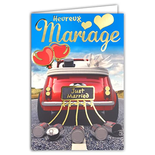 Lyckokort bröllop med guldguldguldpläterat Just Married bil röd Cabrio Vive brud ballonger hjärta god gata, bröllopsresa, tillverkad i Frankrike