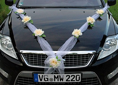 Chexin Bilsmycken bröllop vit, bröllopsbil dekorationsset, bil bröllopsgirlang, blomdekoration bil bröllop, gör-det-själv vit gasväv rosdekorationsset, bilsmycke bröllop med 9 rosor, 2 x 1,6 m lång