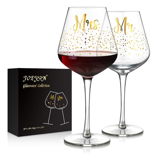 Joeyan Par Mr och Mrs vinglas med presentask, gulddekoration, rödvinsglas, vitvinsglas, bröllopspresent för brudpar, årsdag, förlovning, alla hjärtans dag, munblåsta kristallglas med gravyr, 520 ml
