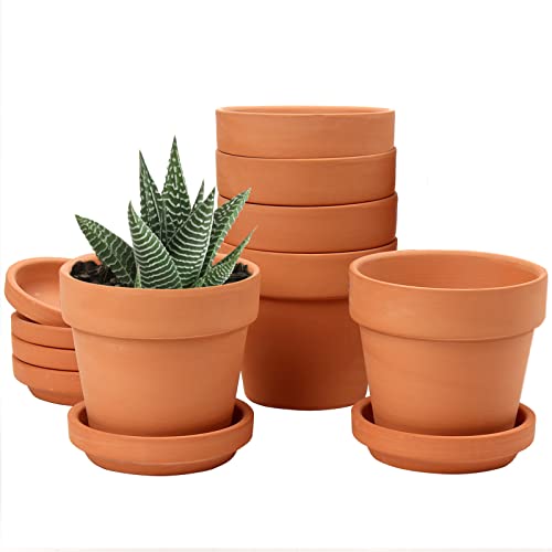 Terrakottakrukor med fat – 6-pack lerkrukor, 12,7 cm, keramikkruka för kaktus, suckulenter eller blommor, med dräneringshål, perfekt för växter, hantverk och bröllopspresent.