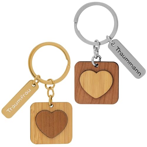 GRUSS & CO nyckelring "Drömkvinna, drömman" | Hänge set med 2 trähängen, berlock och nyckelring | Present till par, bröllopspresent | 48562, flerfärgad, Länge 7 cm, Motiv "Drömman & drömkvinna, trä"