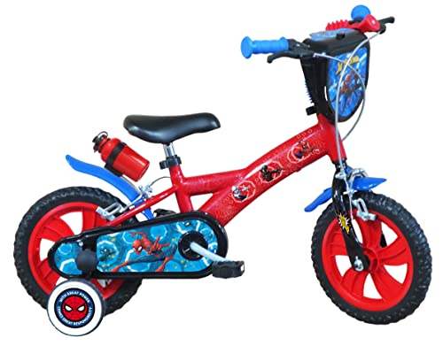 ATLAS Spindelmannens cykel utrustad med 2 bromsar, dekorativ frontplatta, slamskydd, hölje och stabilisatorer, flaskhållare för pojkar, röd och blå