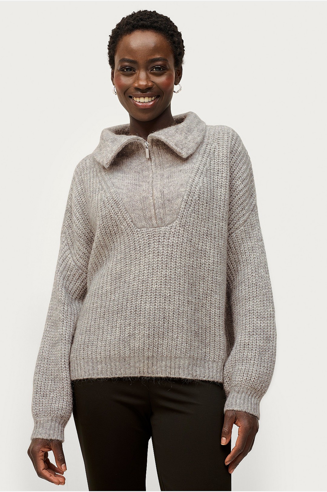 Second Female - Tröja Lusinda Knit T-neck Zip - Grå