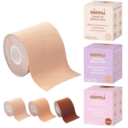 Nippli Shape Up Breast Tape – bröstvårtsskydd 7,5 cm x 5 m, inkl. 10 bröstlappar – brösttejp – för perfekt grepp utan bh – fuktbeständig, naken, 7,5cm x 5m Rolle