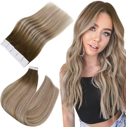Easyouth Äkta löshår med dubbelsidig tejp, balayage, brun, brun, ombre, platinablond, äkta remy-förlängningar #6/60/6, 50 cm, 50 g, 20 st