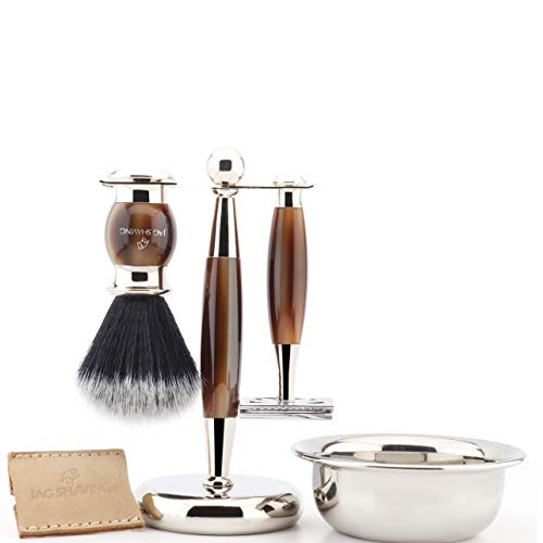 Jag Shaving Rakapparat för män med dubbel kant rakhyvel med läderpåse, svart syntetisk rakborste, skål och stativ perfekt presentset för män