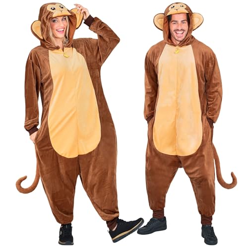 W WIDMANN MILANO Party Fashion – Apa jumpsuit för vuxna, brun plyschoverall med huva, djurdräkt för karneval