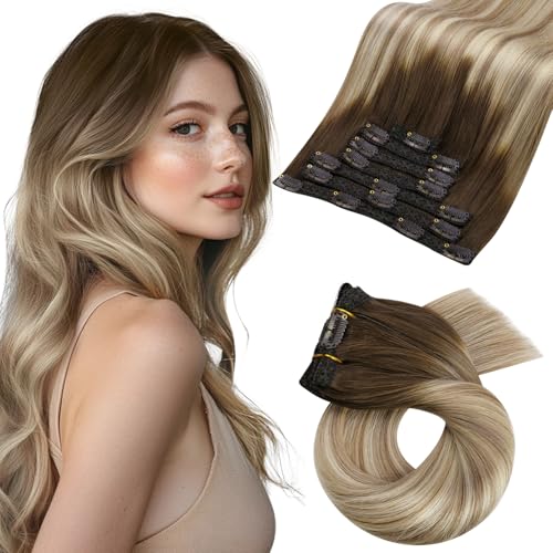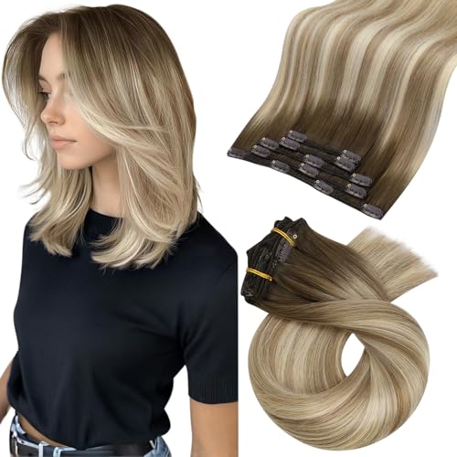 fshine Clip in hårförlängningar mänskligt hår 35 cm kastanj brun bleknar till platina blond och kastanjebrun 120 g 7 st äkta hår silkeslen klämma i hårförlängningar för kvinnor
