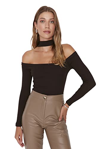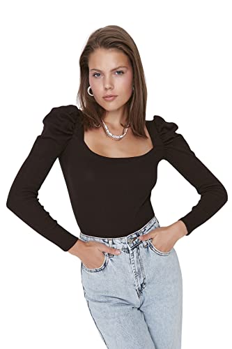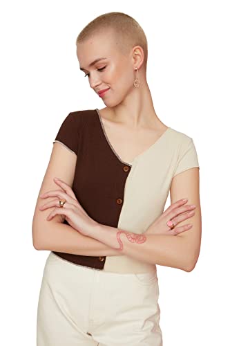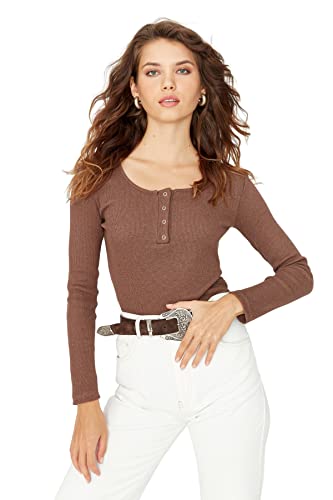 Trendyol blus för kvinnor, svart sida med snap Toyillate stickad blus, Brun, L