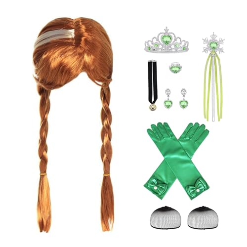 Lång flätad peruk brunt hår prinsessa kostym peruker set med 2 hårnät halsband krona smycken fin utklädnad tillbehör för kvinnor flickor födelsedagsfest cosplay gåva