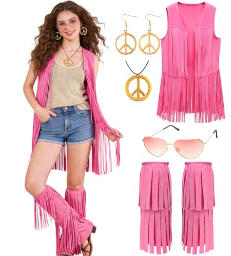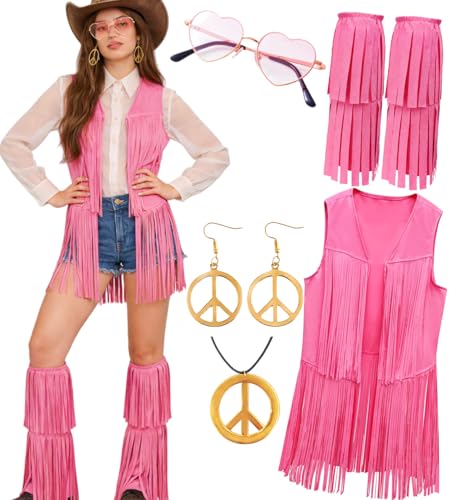 Hippie kostym dam set cowgirl kostym hippie taffel väst tillbaka till 70-talet outfit halloween temafest karneval festival karnevalkostymer (brun, L) (rosa, M)