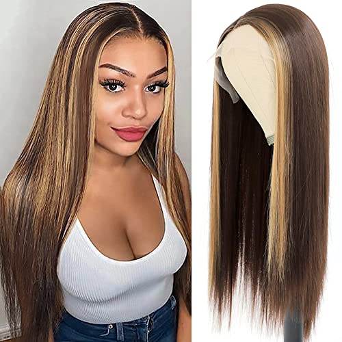 PORSMEER Kvinnor Svart mix Brun Lace Front Rak Peruk Afro Lång Rakt Naturliga Hår Peruker för Kvinnor, Spets Främre Naturligt Värmebeständigt Syntethår Peruk för Fest Cosplay Kostym Dagligen 24"