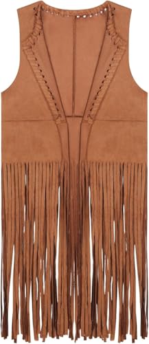 LEACOOLKEY kvinnor hippie kostym fransväst 60-talet 70-talet falsk mocka tofs väst för karneval halloween cosplay party, A-brun (lång), XXL